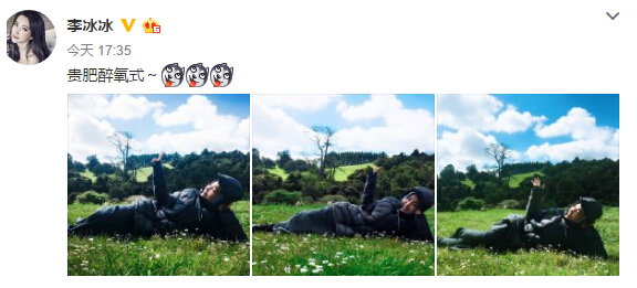 10月19日下午,李冰冰在微博晒出一组近照写道:“贵肥醉氧式。”照片中,李冰冰躺在草地上,虽然穿着厚厚的衣服却难掩身材和美丽,显得十分惬意,网友纷纷留言“这是在哪,要穿着么多”,“不管怎么样都漂亮”,“好美的人,好美的地方”。