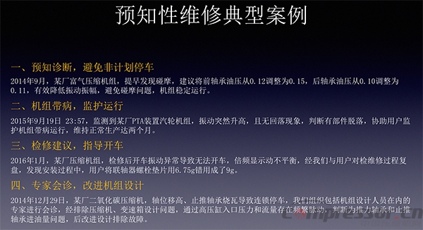 会上华遵还分享了部分沈鼓云服务的成功案例,包括:机组预知诊断成功避免非计划停车案例;机组带病监护运行案例;检修建议指导开车案例;专家会诊改进机组设计案例。