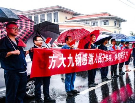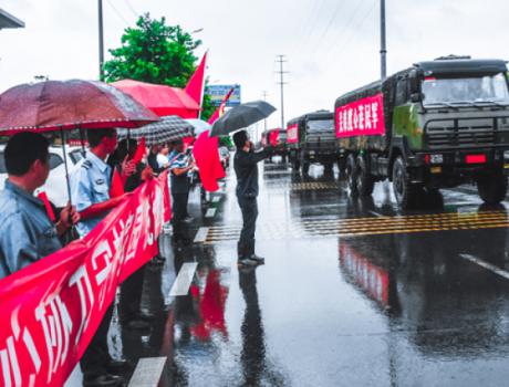 7月27日凌晨,湖口县电闪雷鸣,天空中下起了暴雨。得知驰援湖口抗洪部队今早将离开湖口,当天早上不到5点,30多名方大九钢员工冒雨前来送行,表达深深感激之情,尽显军民鱼水情。