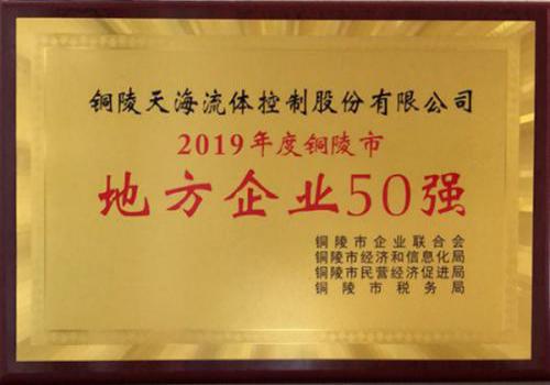 为展示我市骨干企业的良好形象和发展业绩,激励和发挥优秀企业家的作用,经铜陵市企业联合会、市经信局、市民促局、市税务局联合开展了2019年度铜陵市“地方50强企业”排序活动中,铜陵天海流体控制股份有限公司荣获“铜陵市地方企业50强”称号。