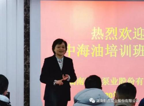 在培训班开班仪式上,湖南耐普泵业总经理周红女士代表公司对远道而来的学员们表示了热烈的欢迎。她说:“中海油是湖南耐普泵业的重要战略合作客户,多年来在中海油集团和各分公司的大力支持下,耐普泵业为中海油lng、海洋平台及码头等提供了诸多套立式海水泵、立式消防泵组等产品,其优质的产品和优良的服务赢得了赞誉。我们衷心感谢中海油集团对耐普泵业的长期信赖与充分肯定,同时希望各相关单位能一如既往地给予耐普泵业更多支持和关心!”最后周总预祝本期泵类设备培训班圆满成功。