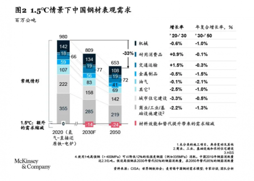 目前,中国钢铁行业碳排放量约占中国碳排放总量的15%,是碳排放量最高的制造行业。全球每年生产和使用高达18亿吨钢铁,其中将近50%的钢产于中国内地,中国钢铁行业碳排放量也约占全球钢铁行业碳排放总量的50%。根据麦肯锡测算,如果要实现本世纪末全球平均气温上升不超过1.5℃的情景,到2050年中国钢铁行业须减排近100%,这是极具挑战的目标,需要从钢铁消费、生产、技术、供应等多个关联领域共同推进零碳转型。