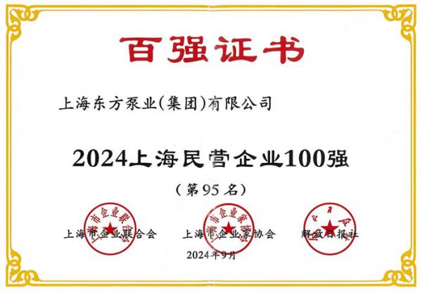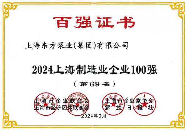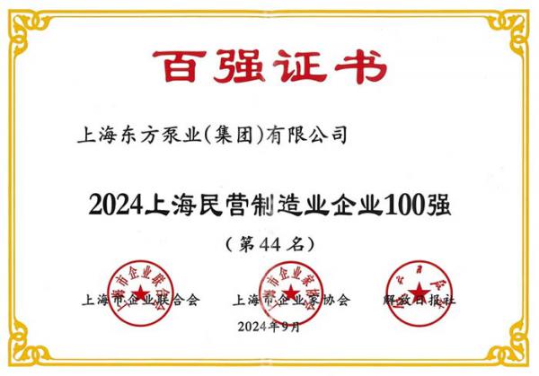 近日,2024上海百强企业评选结果揭晓,上海东方泵业(集团)有限公司凭借出色的经营成绩和持续创新,荣登多个榜单,成功跻身2024上海民营企业100强(第95名)、2024上海民营制造业企业100强(第44名)及2024上海制造业企业100强(第69名),再创佳绩。