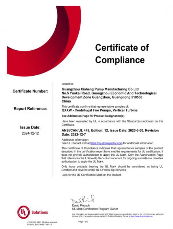 2024年12月12日,广州市昕恒泵业制造有限公司的xhlc系列立式长轴泵正式获得美国ul认证。作为全球知名的产品安全认证机构,ul solutions以严苛的评估和测试标准著称,此次认证进一步彰显了昕恒泵业在产品质量和安全性方面的卓越表现。