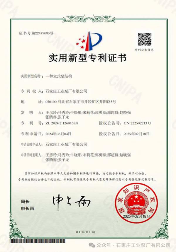 2025年5月12日,石工泵公司自主研发的“一种立式泵结构”成功获得国家知识产权局颁发的实用新型专利证书,标志着该公司在工业泵结构创新方面实现了新的技术突破。此次专利的获得,不仅进一步夯实了石工泵公司在泵类装备领域的技术积累,也为公司“技术开发与市场开发”双轮驱动战略注入了新的发展动力。