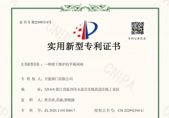 公司负责人表示,此次专利的成功授权不仅是对万能阀门创新研发能力的肯定,也代表着企业在阀门维护便捷化领域迈出了新的步伐。未来,万能阀门将继续以用户需求为导向,不断完善平板闸阀产品结构,提升智能化、模块化水平,为客户提供更加高效、可靠、便于维护的阀门产品。