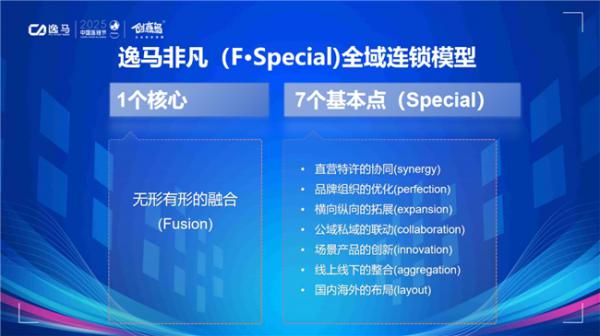 结合长期实战研究,马瑞光博士系统分享了逸马自主构建的 “逸马非凡(f·special)全域连锁模型”,该模型围绕“多模式协同、品牌组织优化、公私域联动、线上线下一体化”等关键模块展开,形成一套支持连锁品牌稳定复制、持续进化的战略操作体系。模型核心强调:在ai逻辑主导的新阶段,企业增长的确定性将来源于系统的精细度与组织的协同性。